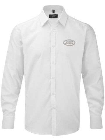White, long sleeve Herringbone formal shirt, embroidered with the Land Rover logo in silver on the left chest and upper back.